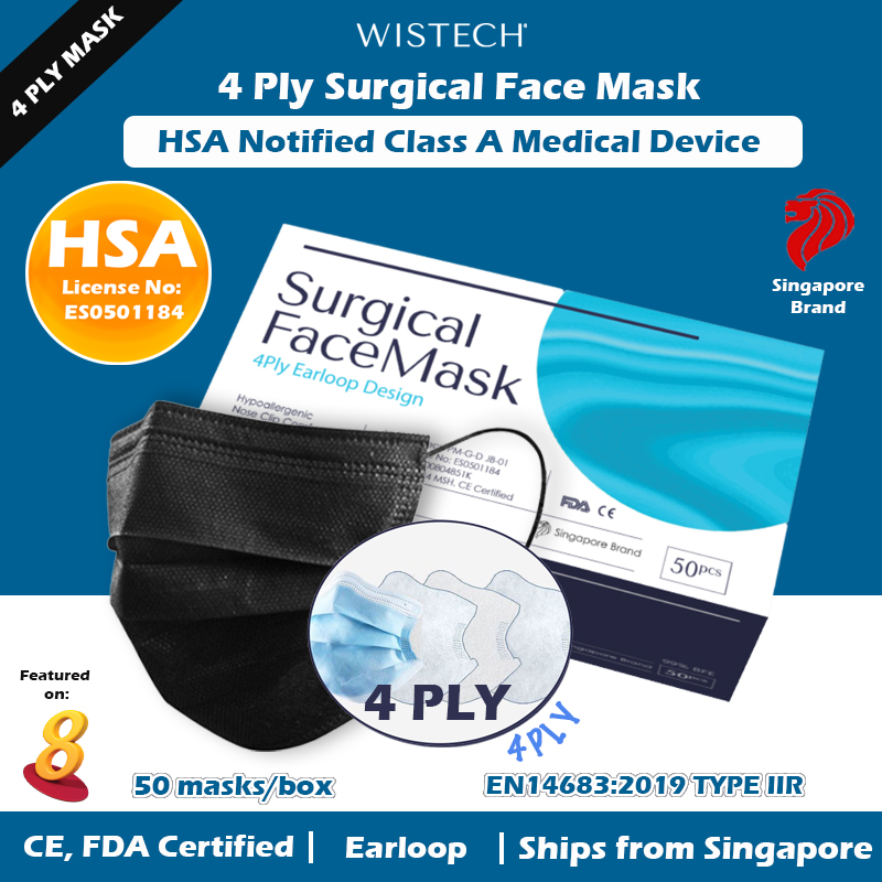 [GET %% OFF MIX AND MATCH] Wistech 4 Ply Surgical Mask, 50 pieces, HSA Notified Medical Device, FDA CE Approved, BFE 99%, Singapore Ready Stock
