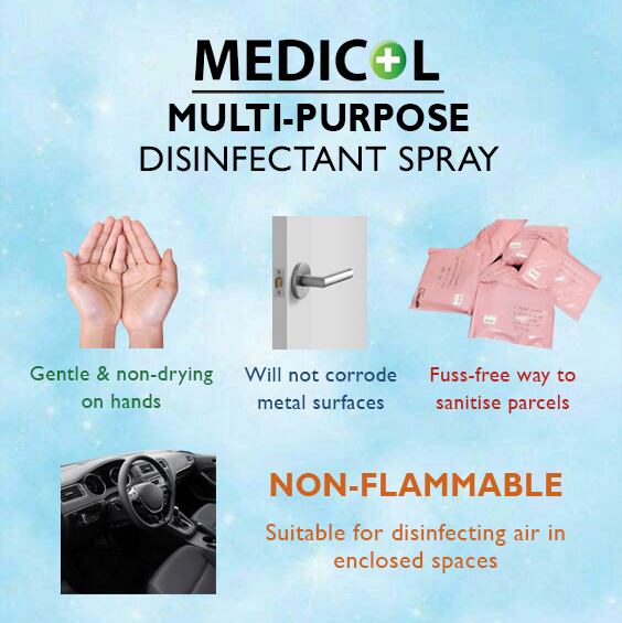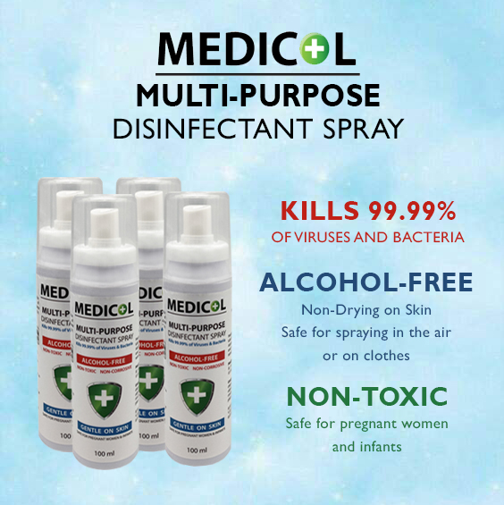 Formulated using hypochlorous acid, a naturally occurring substance, MEDICOL kills 99.99% of viruses, bacteria and germs, and it is Non-Flammable, Non-Drying to the skin, and Non-Corrosive. It is extremely safe, and effective at the same time!